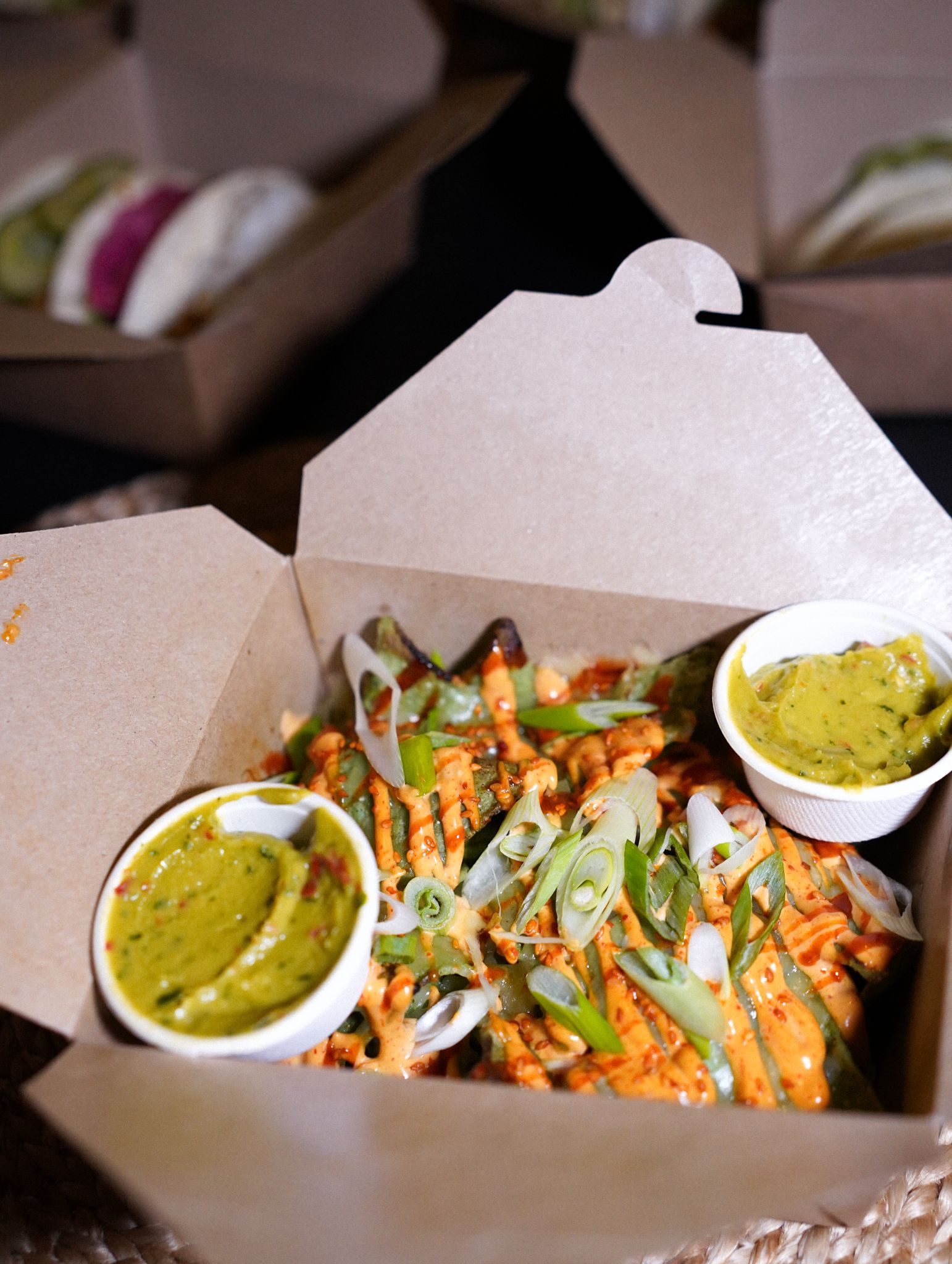 Small: Parmesan pomfritter, spicy korean chicken og 2 valfria-tacoer pris per person